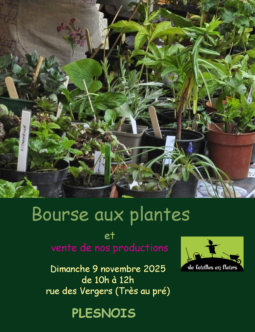 ![]() | DE FEUILLES EN FLEURS organise une BOURSE AUX PLANTES à PLESNOIS le dimanche 9 novembre 2025 de 10h à 12h Vous pourrez aussi y acheter nos productions : Sachets de lavandes Couronnes d'automne | ||